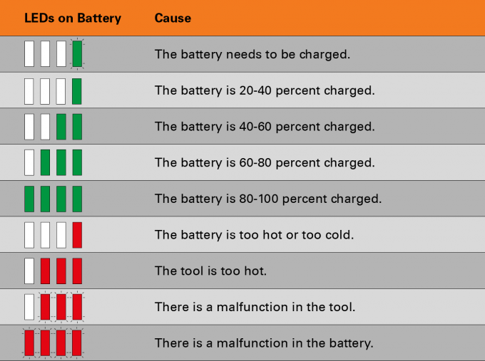 - Tres LEDs rojos encendidos: la herramienta está demasiado caliente. Antes de seguir trabajando deberá esperar a que el equipo se enfríe.